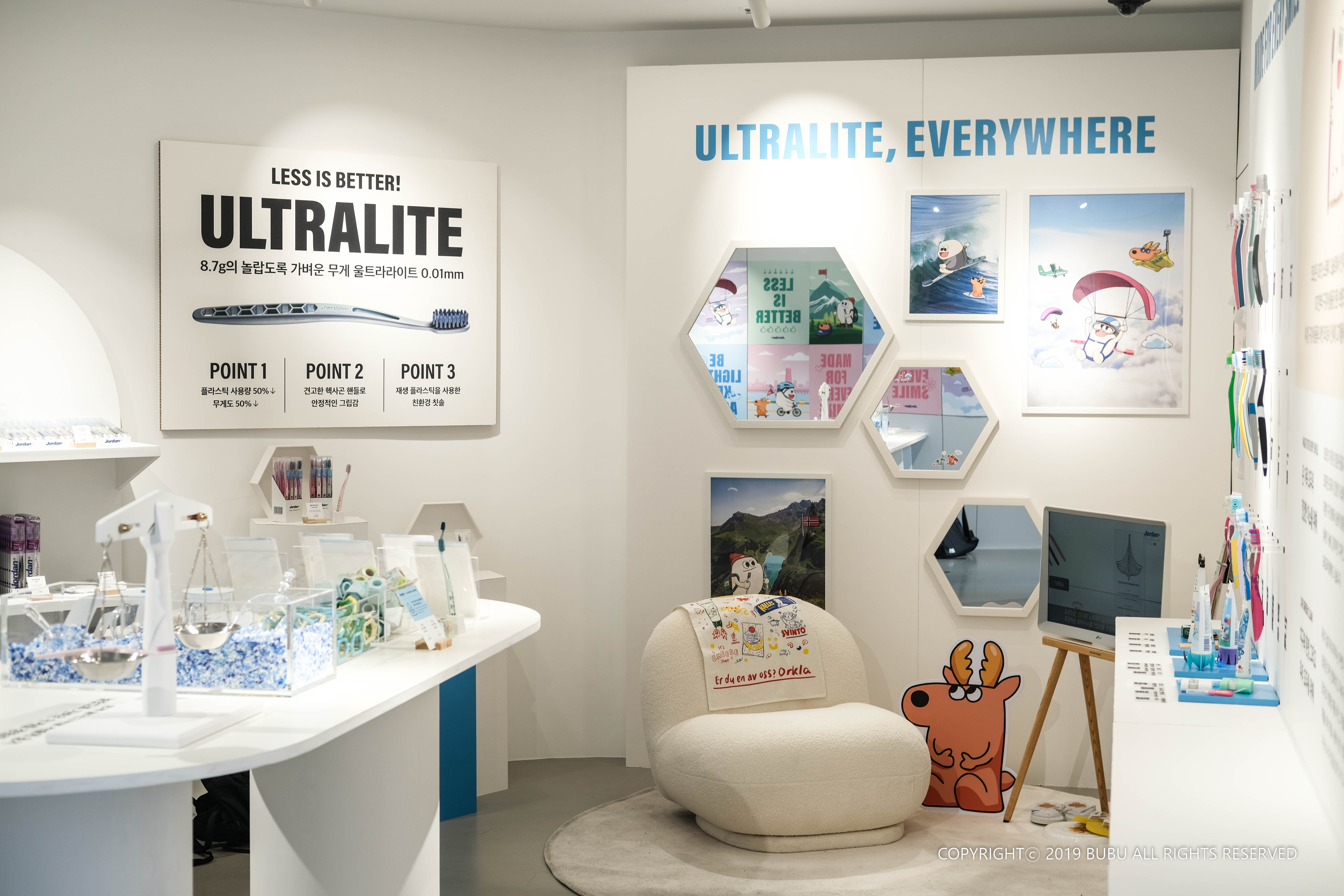 칫솔 브랜드 조르단의 캐릭터 집을 심플하게 디자인한 팝업스토어